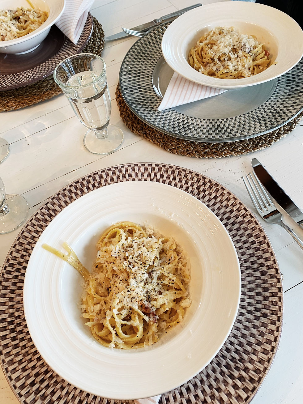 Roomassa asuessani söimme carbonaraa talvisin koska se on jonkun verran tuhdimpi ruoka. Kotona Suomessa teemme sen aina kun haluamme nopeasti jotakin täyttävää ja herkullista.